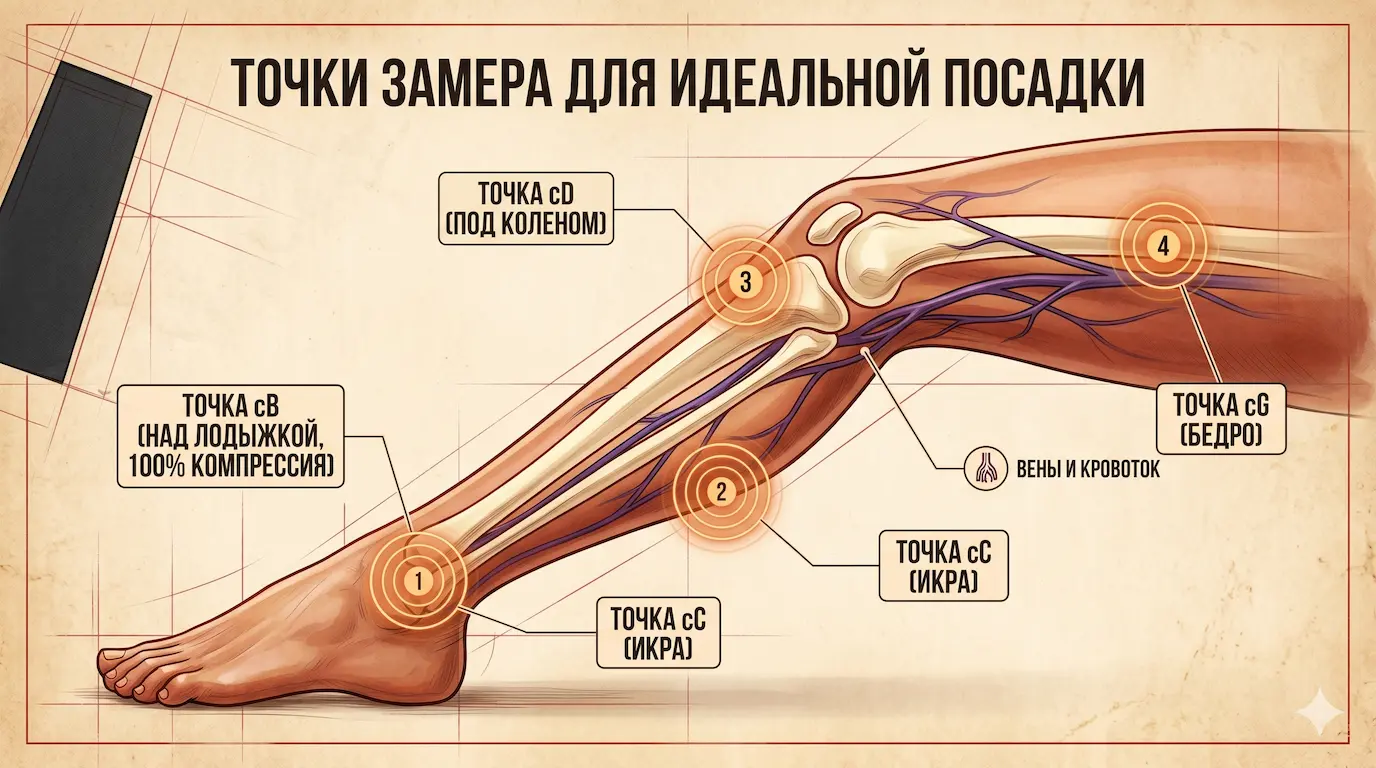 - Точка cB (над лодыжкой): Самое узкое место голени. Это важнейший замер — здесь компрессия всегда 100%.