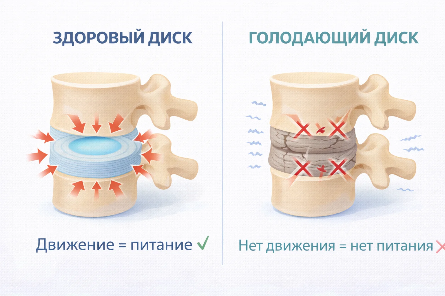 «Межпозвонковый диск — это аваскулярная структура. В нем нет собственных кровеносных сосудов. Он питается через диффузию, как губка: сжался — отдал отработанную жидкость, разжался — впитал свежую, насыщенную кислородом и питательными веществами», — объясняет врач-невролог.