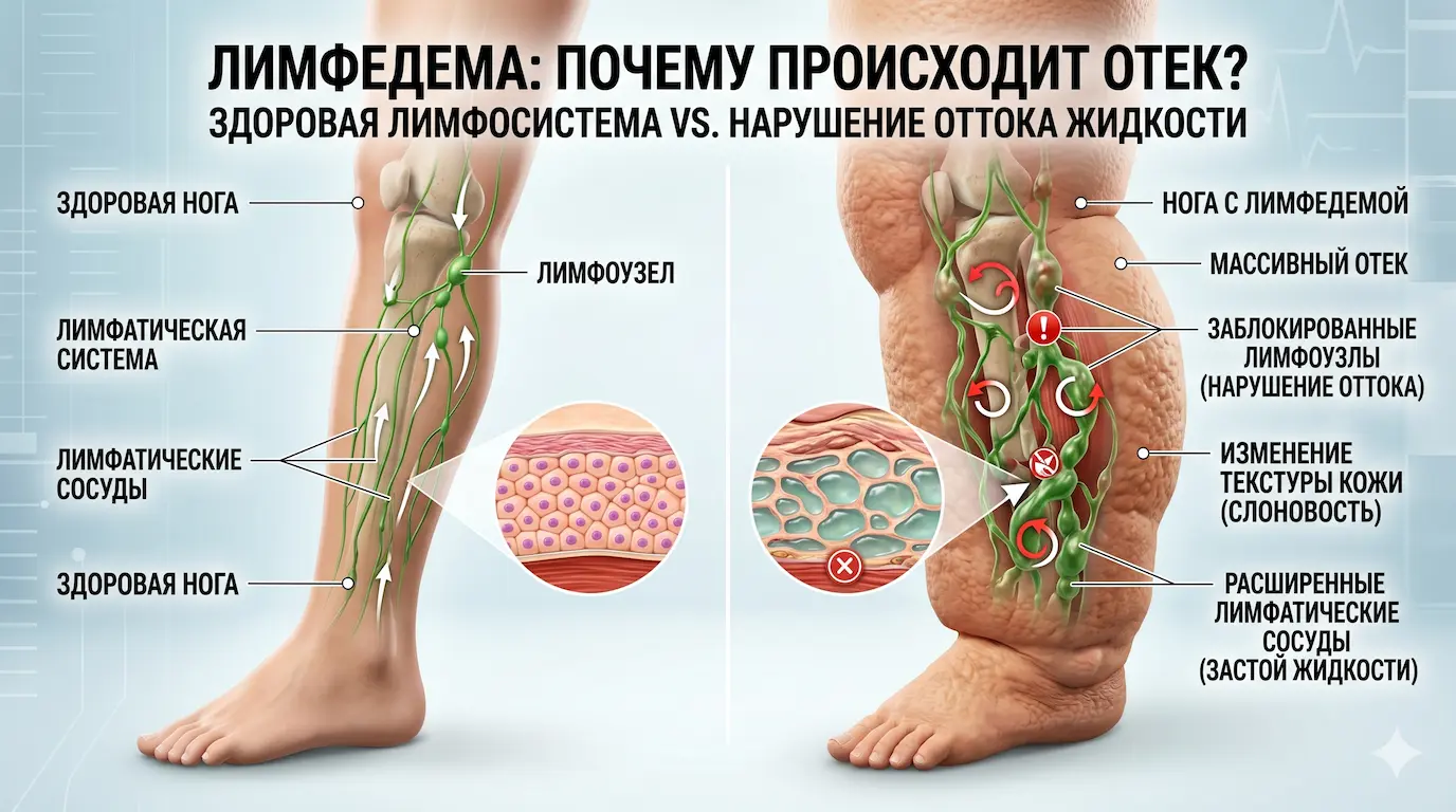 Лимфедема — это состояние, когда лимфа перестает оттекать от тканей, и нога начинает увеличиваться в объеме. В запущенных стадиях это называют слоновостью ног. Главная ловушка здесь — попытаться вылечить это обычными антиварикозными чулками. Это не сработает, и вот почему.