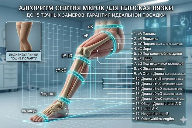 2. Фиксация результата: Только когда объем ноги стабилизировался, снимаются мерки для трикотажа плоской вязки. Носить его нужно будет пожизненно.