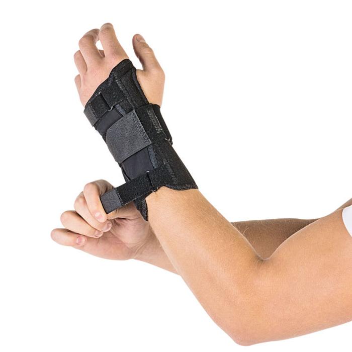 - две узкие шины по тыльной поверхности предплечья и система лент с застежками «Велкро» плотно фиксируют запястье в функционально выгодном положении