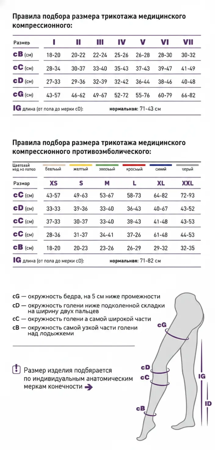 Для правильной работы компрессии изделие должно точно соответствовать анатомии ноги. Замеры рекомендуется производить утром, до появления отеков. Основные точки замера: cB (лодыжка), cC (икра), cD (под коленом) и cG (бедро).