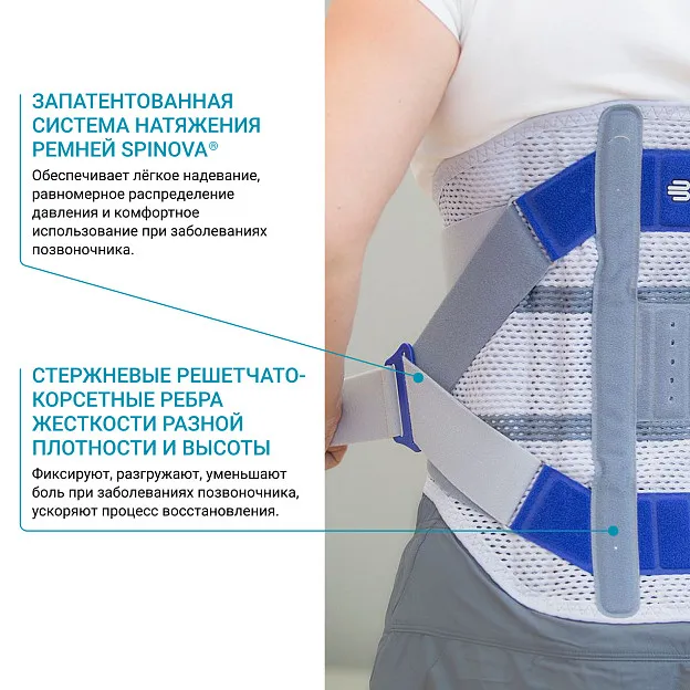 - Эластичные ремни Spinova позволяют точно регулировать степень компрессии и стабилизации.