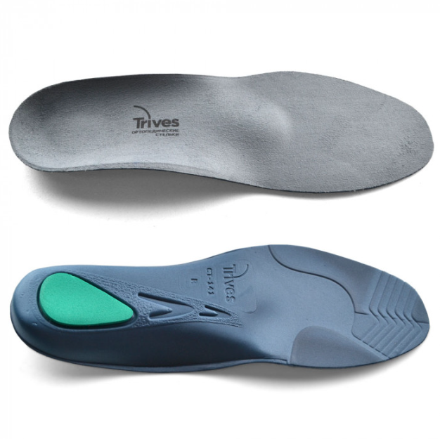 Ортопедические стельки разгружающие Тривес СТ-141.1 для повседневной обуви. Стельки изготовлены из мягкого ЭВА-полимера с высокими эластичными свойствами, выкладка продольного свода и небольшой метатарзальный пелот, пяточные бортики, пяточный амортизатор ассиметричной формы из двухслойной латексной пены. Подошвенная часть каркаса имеет зоны разгрузки для 1-го и 5-го пальцев. Покрытие «микролайнер» - воздухопроницаемый износостойкий материал, обеспечивающий комфорт и возможность гигиенической обработки.